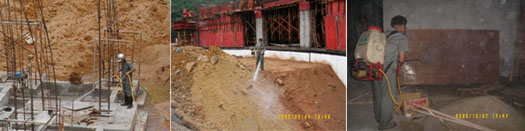 (2)室內(nèi)地坪回填平整后,在澆混凝土地坪或擱置防潮架空板之前,在離內(nèi)墻面四轅50cm墊層噴澆藥液。根據(jù)地坪滲透性,每米均勻連續(xù)噴澆稀釋劑 3000g左右。廚房、衛(wèi)生間等經(jīng)常受潮的房間,用外來雜土回填的地基,地處舊城區(qū)或山邊雜地凡室內(nèi)未經(jīng)開挖的部分地基,都可能有白蟻隱患,應全面施藥。根據(jù)地坪滲透性,每平方米均勻噴澆稀釋劑 3000g左右。